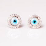 These are round stud earrings featuring a blue “evil eye” design at the center, surrounded by a ring of clear, sparkling stones- cubic zirconia set in a silver base. The central motif, resembling an eye, is commonly used as a protective symbol believed to ward off negative energy and jealousy in various cultures, particularly in Mediterranean and Middle Eastern traditions. The earrings combine fashion with a symbolic amulet, making them both decorative and meaningful accessories