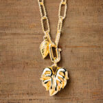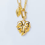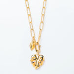 Hanging from the chain are two distinct pendants: a large, sculptural monstera (tropical split-leaf) charm as the centrepiece, and a smaller, detailed leaf charm accent.