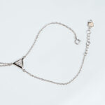It features a delicate chain that typically connects a ring or finger loop to a bracelet around the wrist, with a decorative centrepiece, a small triangle with cubic zirconia. The design rests elegantly across the back of the hand, making it an eye-catching accessory that blends both ring and bracelet elements into one unique piece. Hand harnesses are popular for their bohemian or modern minimalist appeal and are often worn for special occasions or as statement jewellery.