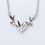 The necklace features a central pendant in the shape of a metallic heart, accented by two sculpted antlers and small ears emerging from either side, creating the silhouette of a deer’s head. The pendant hangs on a simple chain, giving the piece a playful yet elegant appearance suitable for casual or nature-inspired fashion.