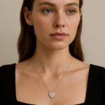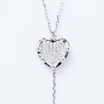 The necklace features a fine silver chain connected to a heart-shaped pendant that is embellished with small cubic zirconia for added sparkle. A slender chain drops vertically from the center of the heart, ending with a crystal accent, giving the piece an elegant and modern look. The overall design is minimalistic yet sophisticated, suitable for both casual and formal occasions.
