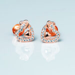 diamonds. Inside each open heart sits a smaller, solid rose gold heart accent. The overall look is feminine and romantic, making these earrings ideal for gifts, especially for occasions such as Valentine’s Day or anniversaries. The combination of rose gold and sparkling stones gives them a modern yet elegant appearance.