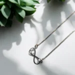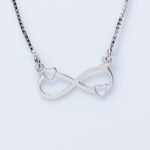 The pendant at the center of the necklace is fashioned in the shape of the mathematical infinity symbol (∞), with a small heart on each loop of the figure. The design signifies limitless love, enduring connection, or eternal friendship. The pendant is attached to a delicate, squared chain, making the necklace both elegant and meaningful for everyday wear or as a gift representing infinite affection.