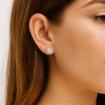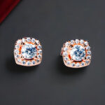 These earrings have a cushion-shaped halo design, featuring a prominent round clear stone at the center, surrounded by smaller clear stones set in a rose gold frame. The halo effect adds extra brilliance and sparkle to the studs, creating an elegant and classic look. This style is timeless and versatile, suitable for both formal and casual occasions, and showcases the shine and beauty of the stones against the warmth of rose gold