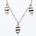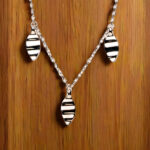 The necklace has three pendants shaped like elongated leaves, each displaying a pattern of alternating black and white horizontal stripes. The pendants are evenly spaced along a simple chain, giving the jewellery a modern and playful look. The leaf motifs and contrast stripes add a touch of natural inspiration and visual interest, making the piece suitable for casual or artistic styles.